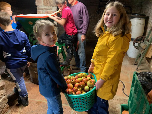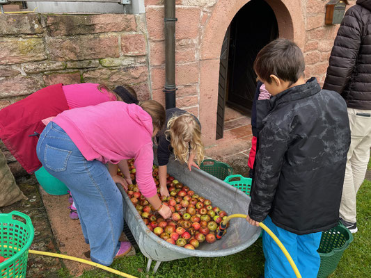 Im Rahmen der Streuobstwiesenpädagogig bieten wir den Kindern in jedem Herbst Streuobstwiesen-Erlebnis-Wochen an. Mit den jüngeren Jahrgängen der Grundschule wird Obst von der Wiese gelesen und mit der vierten Klasse in Eiterbach traditionell gekeltert. So wird der Weg vom Apfel am Baum bis hin zum leckeren Direktsaft in der Flasche zum tollen Erlebnis, dass schließlich auch noch gut schmeckt.